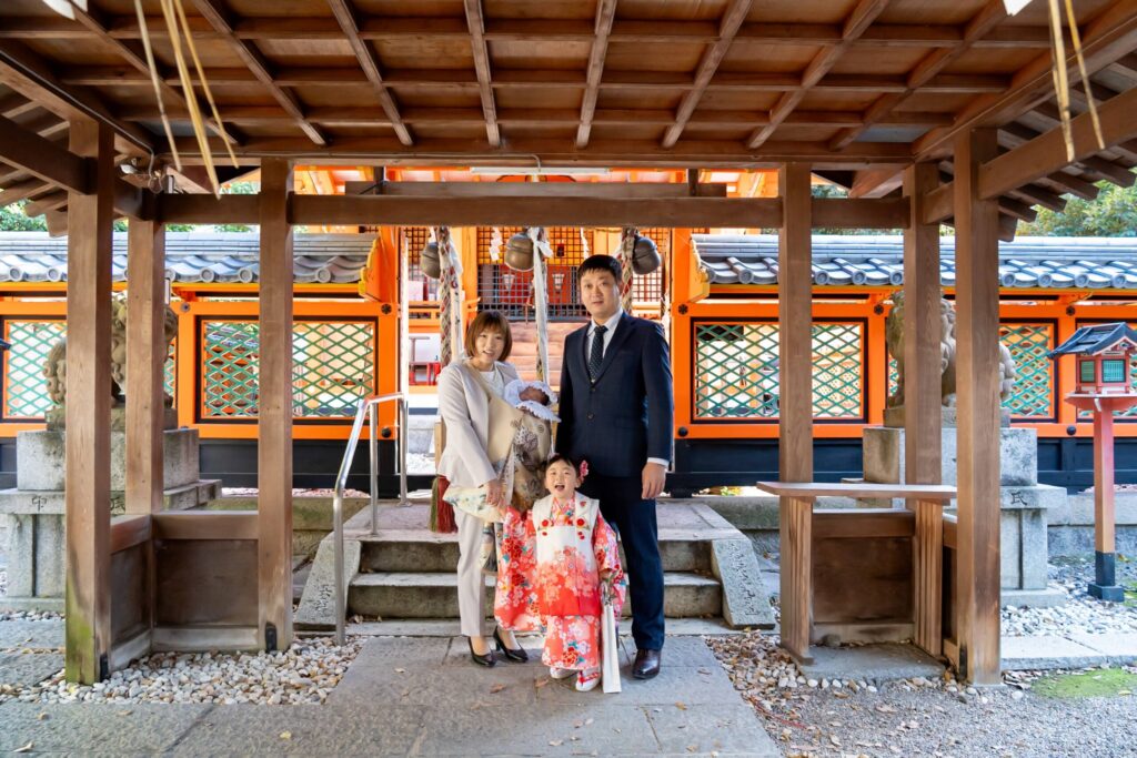 - 朱色が鮮やかな「拝殿・本殿」前 … ご家族全員での記念カットに人気