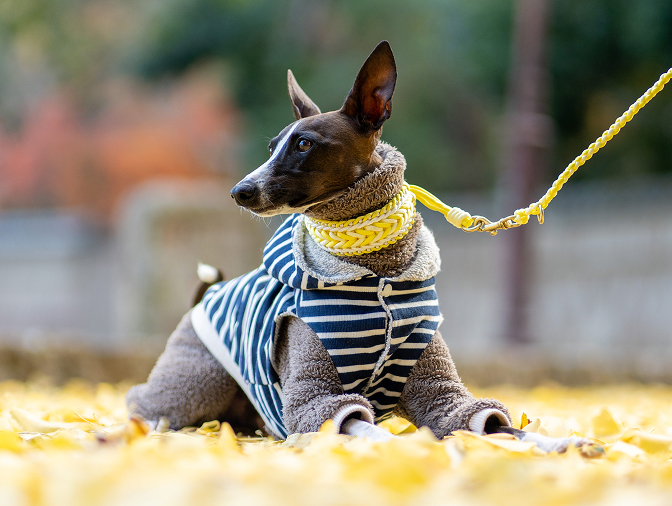 ニットを着た小型犬の自然な表情を撮影したペット写真